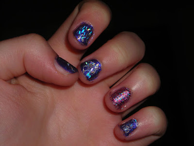 So, the colors are really pretty and all, right? But as I was working on this I remembered why I never buy Sally Hansen. It takes so damn long to dry. The drying time was ridiculous, I keep getting dents even 40 minutes after I painted my nails. This was with a quick dry top coat AND China Glaze quick dry spray! The glitter polish didn't have this problem, it dried very quickly, I really love it. But the purple kept getting all weird on me. Grrr Sally Hansen why can't you just be normal? >:[