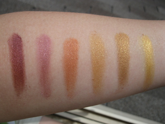 I LOVE HEARTBEATS. I have been searching for an eyeshadow that's a rusty brown-red for the last couple weeks, and this is perfect! I might need to buy a full size of this, because the color looks so great with my brown eyes. I love the rest of these shades too, they are so warm and pretty. I want to do a fall inspired look with them.