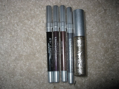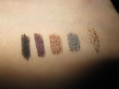 I was most excited to get a 24/7 Set, "Stereophonic", because I had never tried a 24/7 liner. It's a great little set, with four 24/7 mini liners, and one glitter liner. I got it on Haute Look for... get this... $7. The pencils from left to right are Zero, Crash, Underground, Gunmetal, and the glitter liner is Midnight Cowboy.