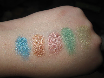 I have 3 loose shadows I got for $5 each from Haute Look. They have been on the UD & Sephora websites lately for $5, although I don't think there's a lot of choices left. I have one pressed shadow, Graffiti, that I bought from Lillian's blog sale a few months ago. From left to right are Shattered, Baked, Shag, Graffiti, and Acid Rain. I think I got Acid Rain from Haute Look, but it may have been from Beauty Ticket.